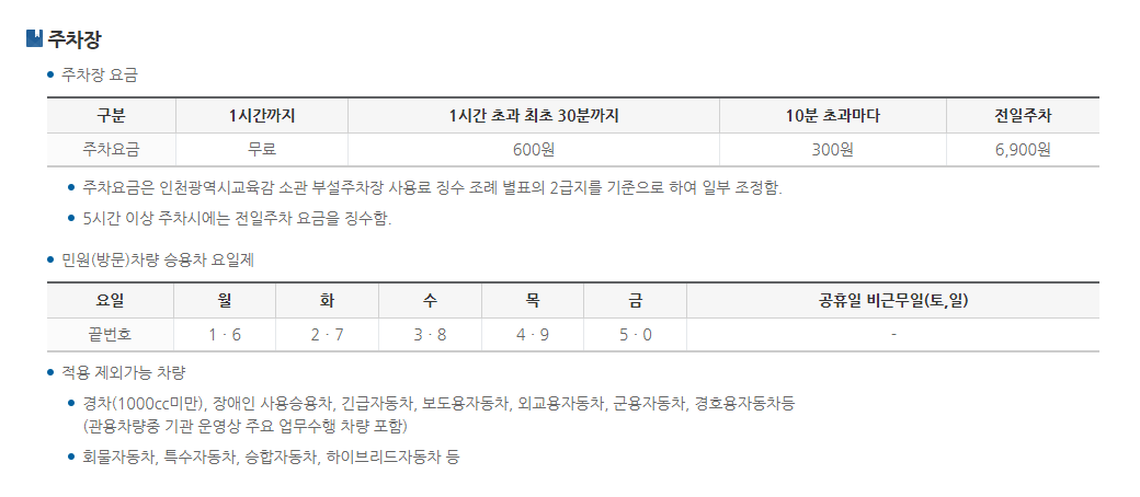 주차장 요금은 1시간까지는 무료이나 1시간 초과 시에는 최초 30분까지는 600원, 그 이후로는 10분 초과마다 300원씩 부과됩니다. 그런데 인천중앙도서관이 인천시교육청과 주차장을 같이 사용하고 있어서 평일에는 거의 만차입니다.